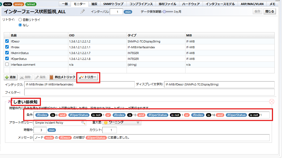 インターフェースの状態監視(UP/DOWN)で特定のインターフェースのみをアラート発報させrことが出来ます。