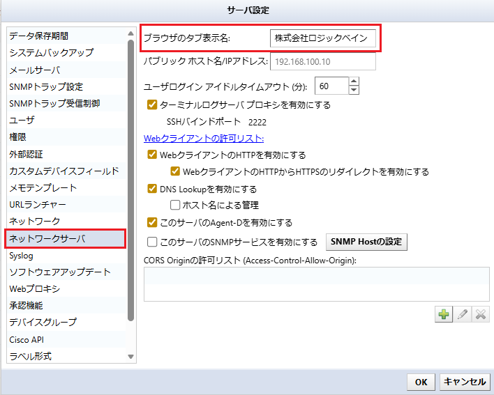 GUIの右上[設定]→[ネットワークサーバ]の画面にて、[ブラウザのタブ表示名]の枠内に入力することで、